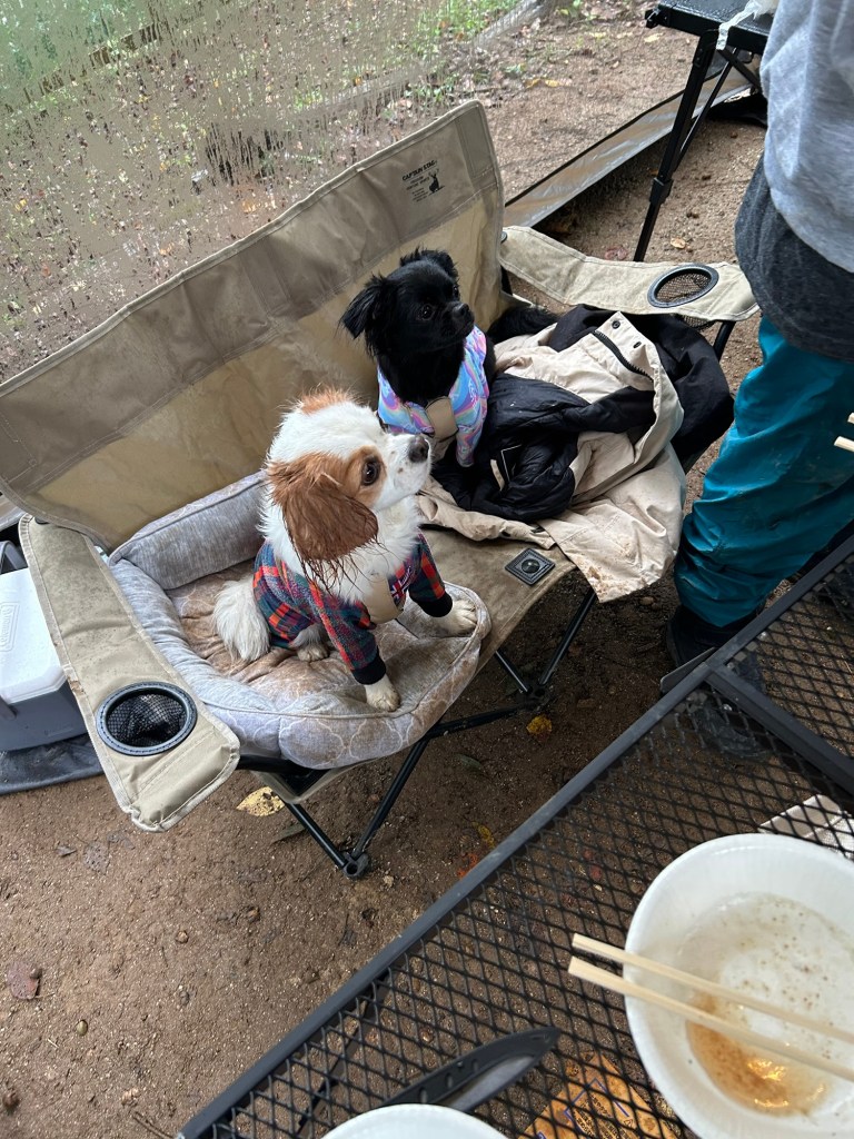 タープを張ればBBQは問題なし 犬たちはテントの中でまったり 周りも犬連れだから気を使わない